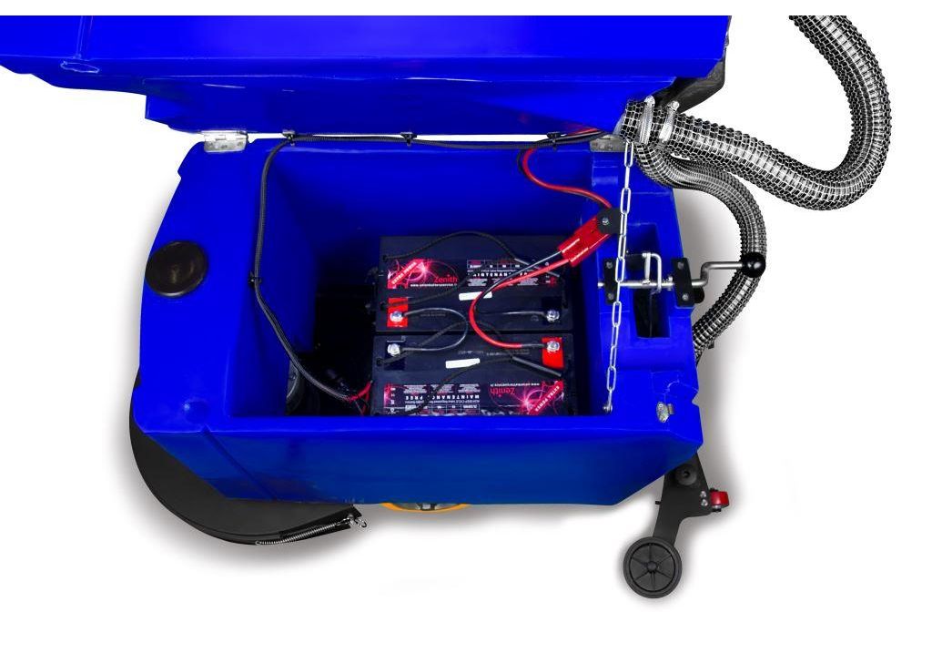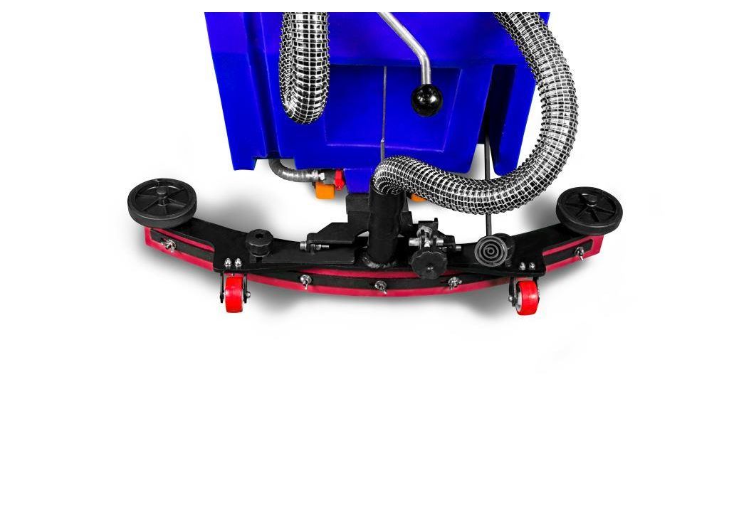 Конструкция поломоечной машины состоит из рамы-тележки, изготовленной из 5-ти миллиметровой стали, с промышленными 180-ти миллиметровыми колесами на подшипниках, баков из ударопрочного полиэтилена, алюминиевого собирающего узла, панели управления, вакуумного мотора, мотора привода щетки и мотора привода основных колес.